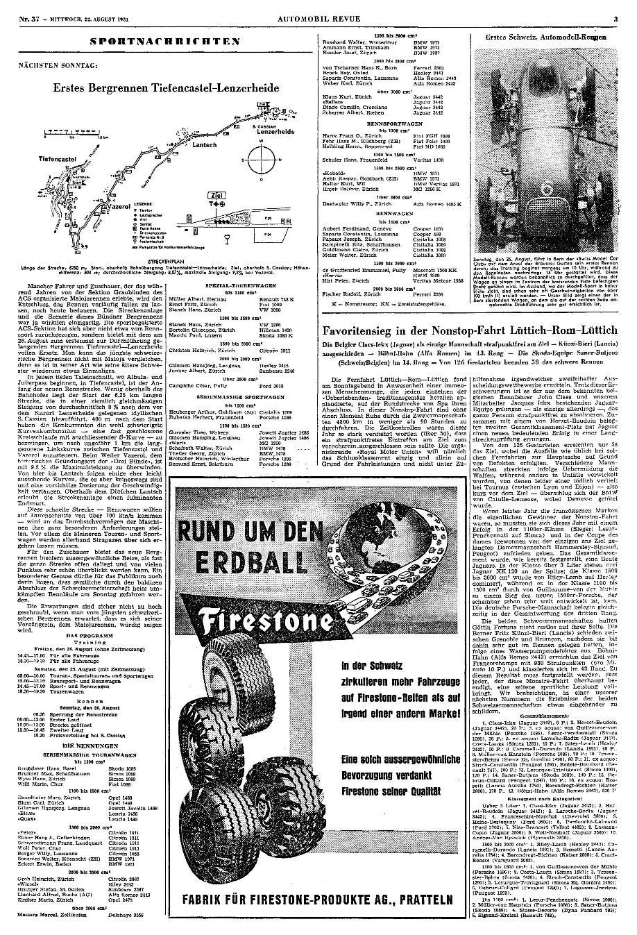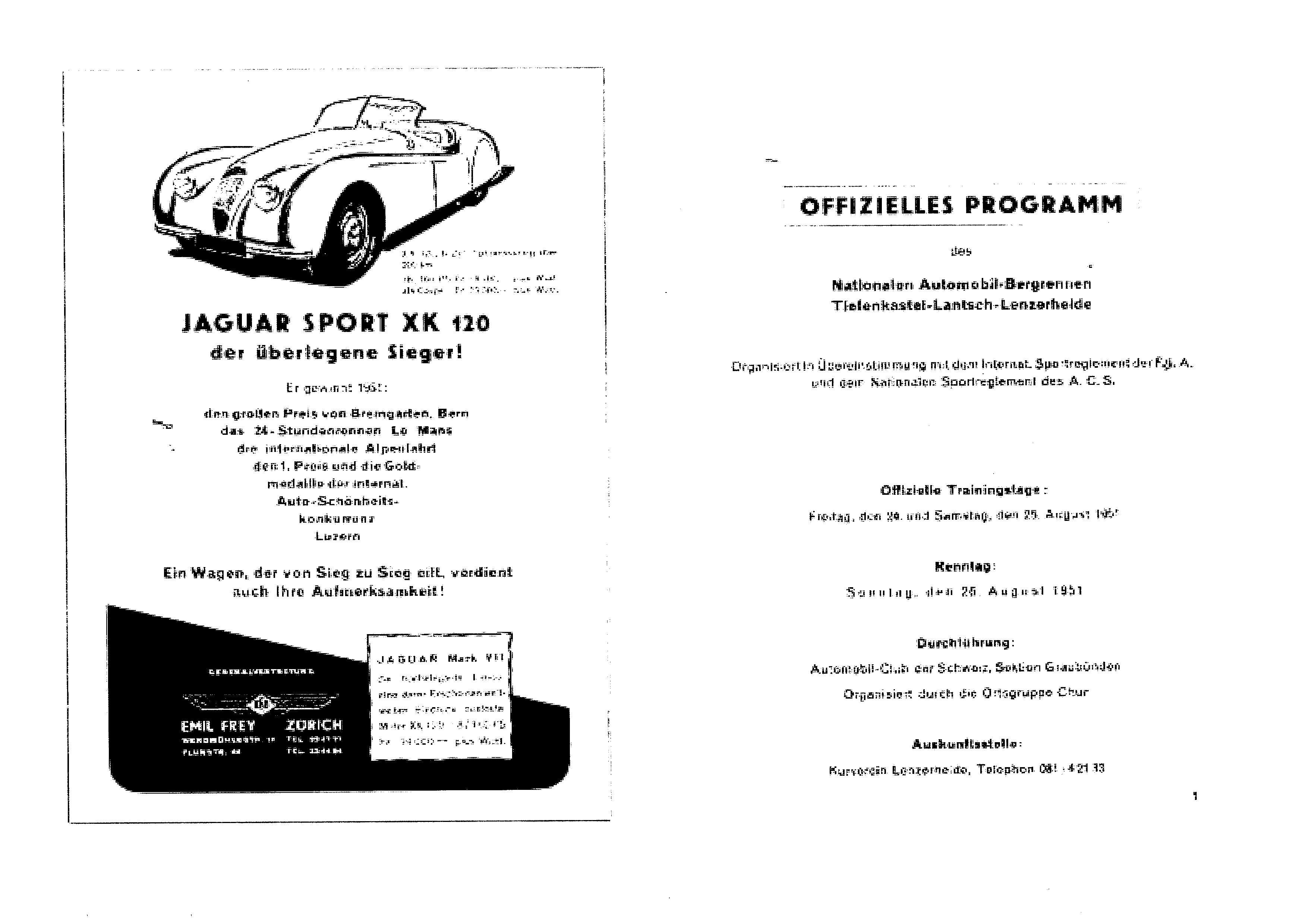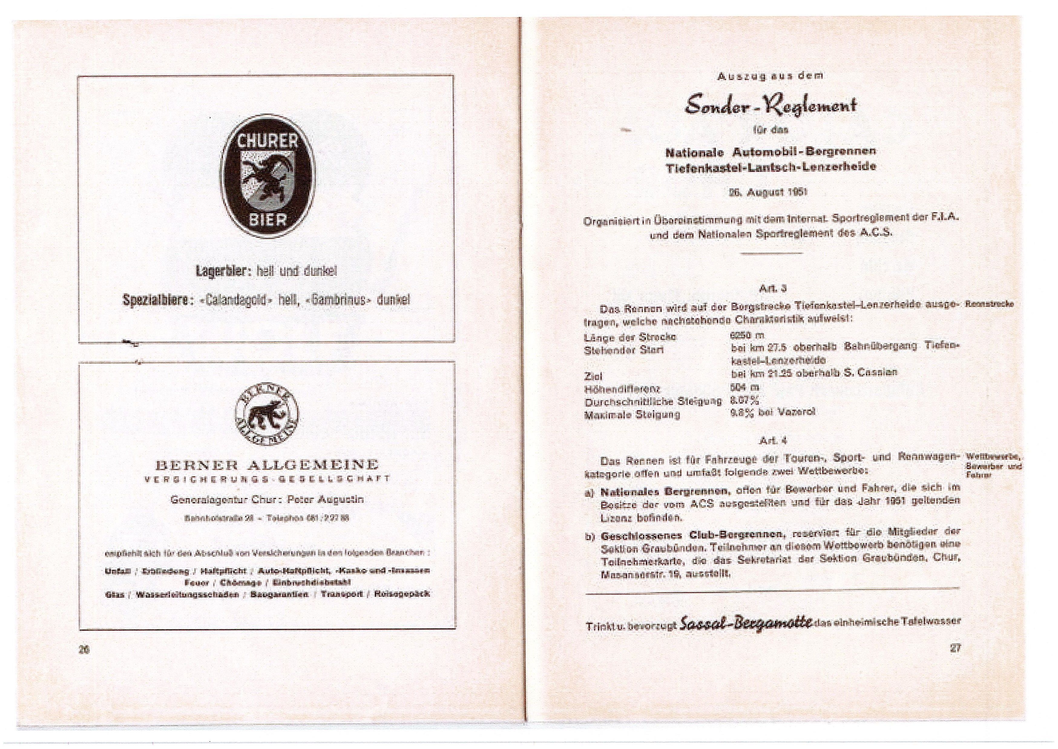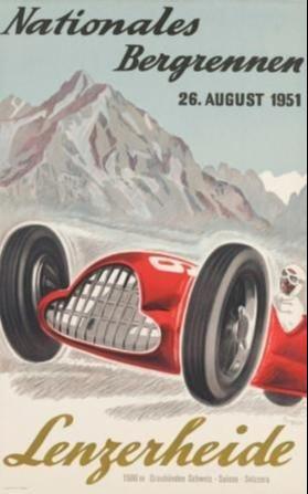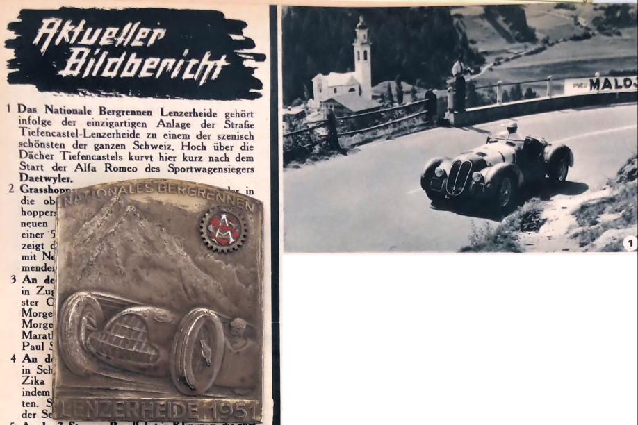 Mit einem der ersten Schweizer Bergrennen erlebten die Einwohner und Besucher der Lenzerheide auf der Strecke Tiefencastel-Lenz-Lenzerheide im August 1951 einen absolut beeindruckenden Motorsport Anlass. Schon das grosse Plakat, auf dem im Vordergrund der an allen Rennen unschlagbare «Alfetta» und im Hintergrund das Lenzerhorn abgebildet waren, beeindruckte mich als jungen Burschen gewaltig.