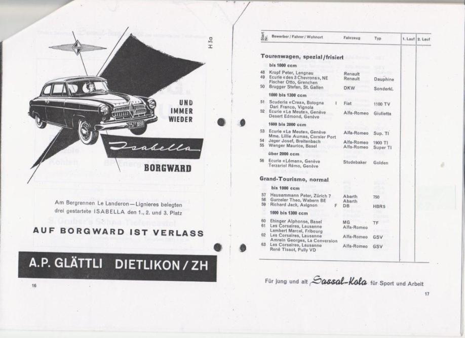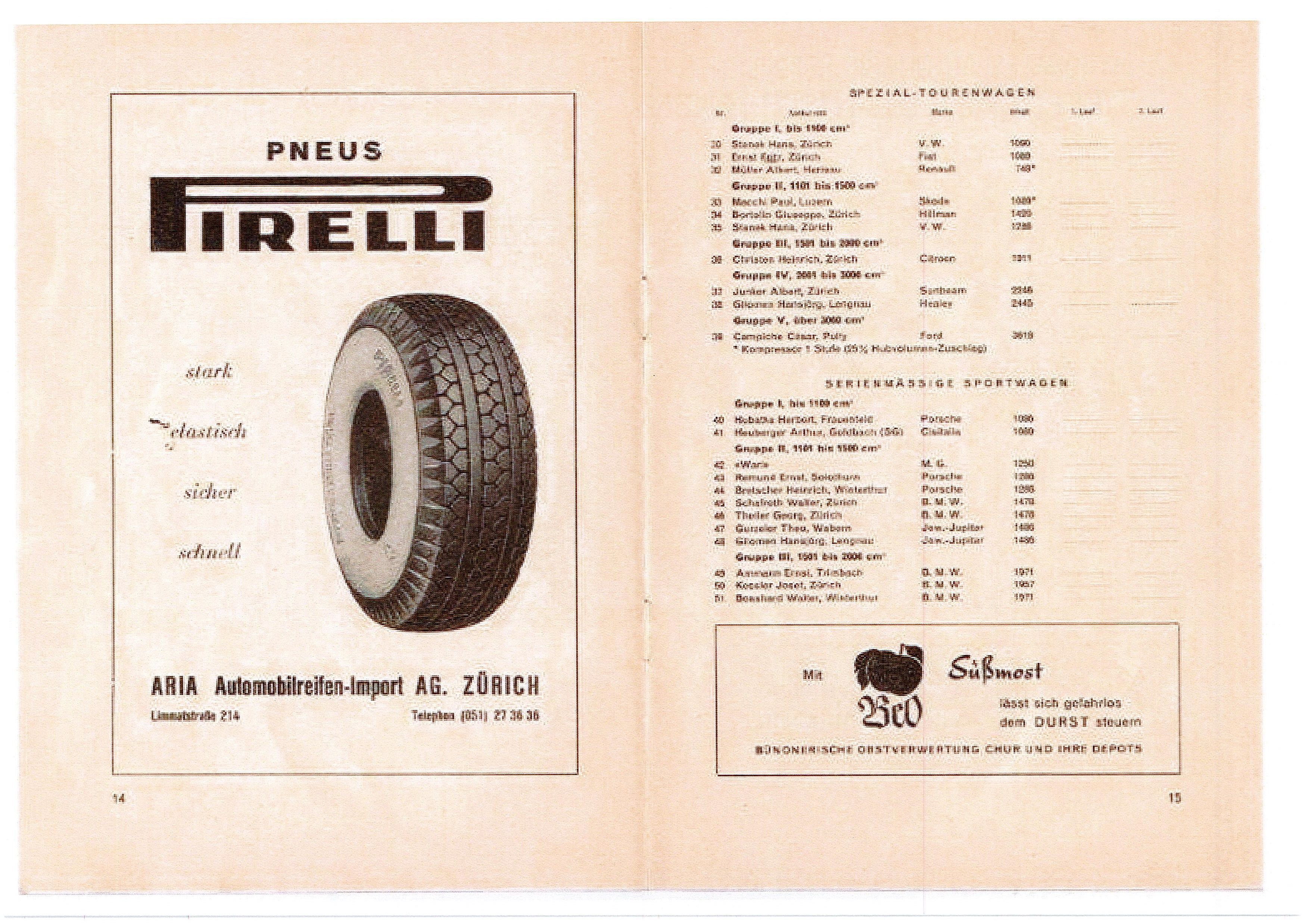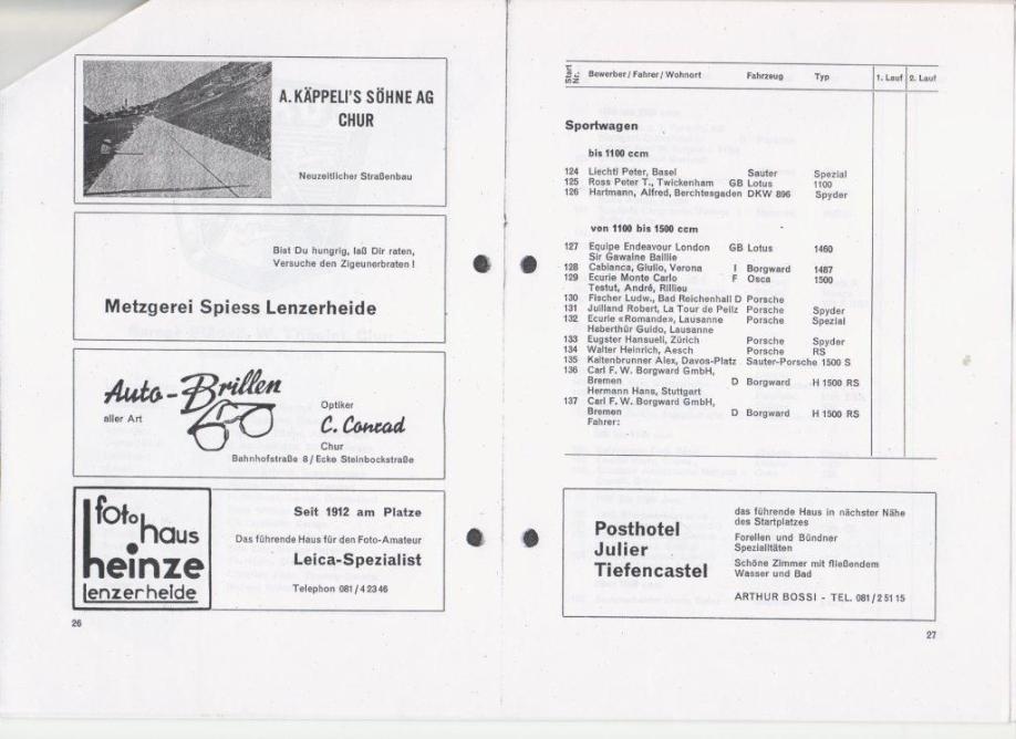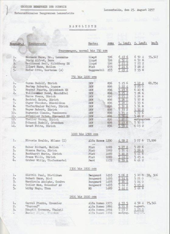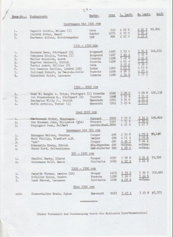 Der spannende grosse Kampf um die europäische Bergmeisterschaft zwischen dem Porsche vom berühmten Rennleiter Huschke von Hanstein (ein RS Bergspyder der jedesmal beim Schalten eine riesige Stichflamme aus dem mittelrohrigen Auspuff stiess), dem Borgward RS von Hans Herrmann (der schon damals mythenhafte Ferrari mit Ludovico Scarfiotti) und dem Maserati 200/S von Willy Peter Dätwyler, der die Europameisterschaft schliesslich auch gewann, war ein unvergessliches Erlebnis.