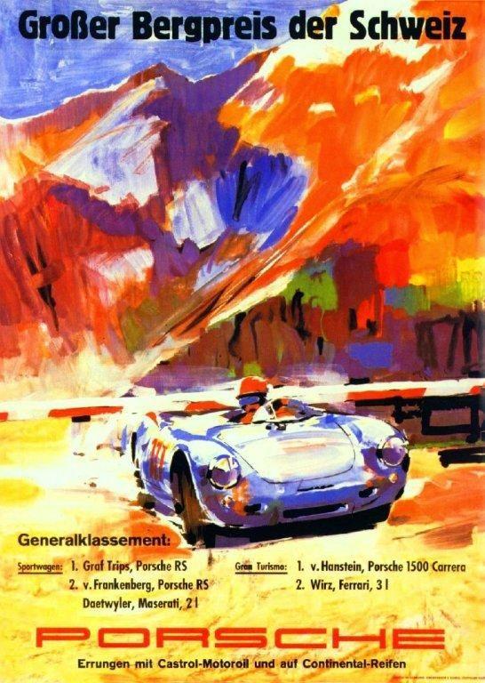 Vermutlich Werbeplakat Porsche/Castrol, nach dem Erfolg an der Europameisterschaft! Einer der 4 EM Läufe fand auf der Strecke Tiefencastel - Lenzerheide statt! Das Bild könnte erneut die Stelle nach der ersten Spitzkehre oberhalb Tiefencastel in Richtung Albulatal zeigen. Im Hintergrund ist der Monolith/geografischer Mittelpunkt Graubünden zu erkennen sein.