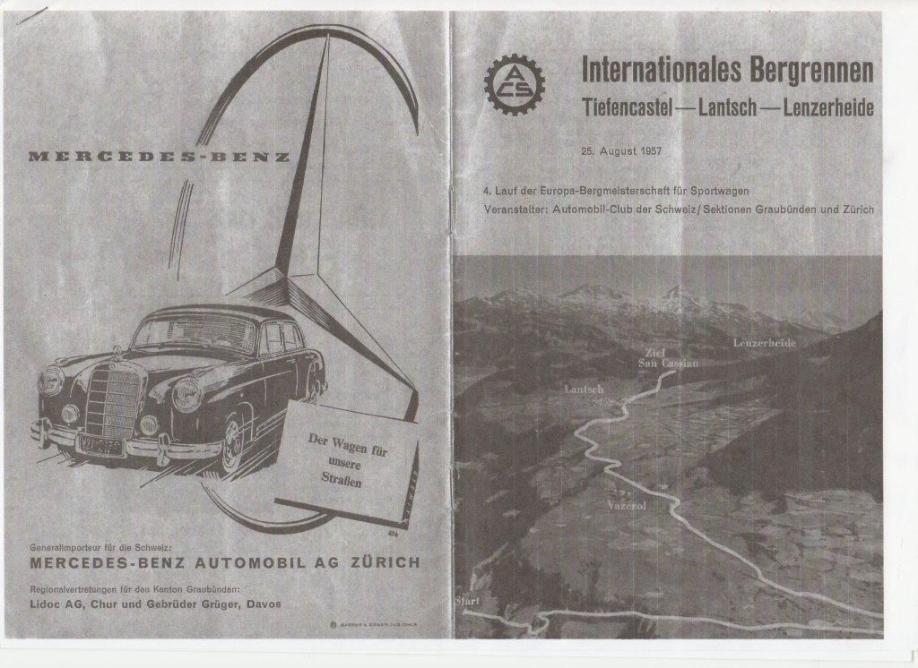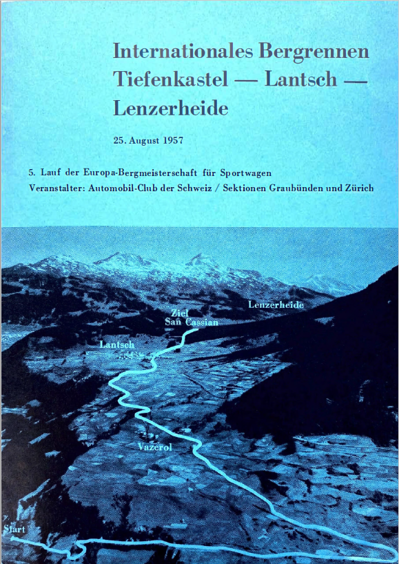 Am 25. August 1957 fand in Zusammenarbeit mit dem ACS ein weiteres internationales Bergrennen statt, welches damals sogar als Europameisterschaft zählte. Als erwachsener Bursche durfte ich dieses Rennen als Helfer meines Vaters, der Chef des Sanitätsdienstes war, auf der gleichen Strecke noch näher erleben. Wir bewunderten natürlich auch unseren Lokalhelden Willy Gruber, der mit Bravour seinen kleinen Ford mehr über die Strecke balancierte als ihn schnell zu fahren. Es waren einige Fahrzeuge dabei, die wir auch heute noch an den Lenzerheide Motor Classics bewundern können. Darunter der Porsche 356 Carrera, MGA, Alfa Romeo Giulietta Veloce, die kleinen und schnellen Fiat Abarth Zagato, Lancia Aurelia B20, AC Bristol (Basis der Cobra), Mercedes Flügeltürer, Triumph TR3, Aston Martin DB2 und viele mehr.