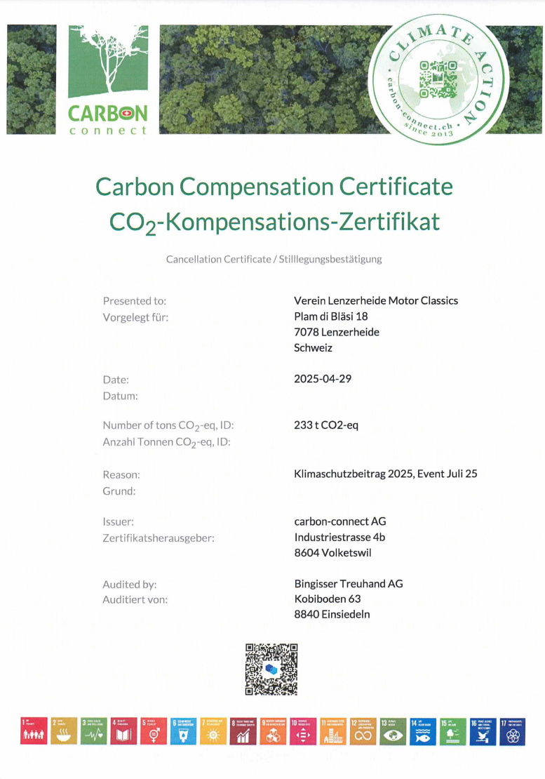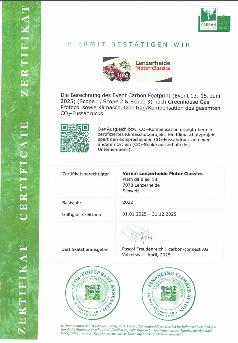 Die Lenzerheide Motor Classics ist ein Pionier: Schon 2016 - als noch niemand davon sprach - war der Anlass klimaneutral. Dank unseren Fahrern und unseren Sponsoren ist unsere Veranstaltung zu 100 % CO2-kompensiert.Unsere Emissionsbilanz weist einen CO 2 -Ausstoss von knapp 134 tCO 2 aus. Den grössten Anteil daran haben die An- und Rückreise der Gäste, wobei diese mit über 85 tCO 2 rund zwei Drittel der Emissionen verursachen. Das Rennen selber verursacht lediglich 3.3% der gesamten Emissionen.