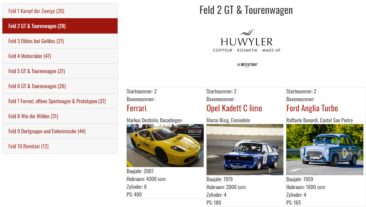 Unter Rennfelder sind alle Teilnehmer/innen der Lenzerheide Motor Classics aufgelistet. Pro Rennfeld gibt es die Möglichkeit zuoberst das Logo zu platzieren.